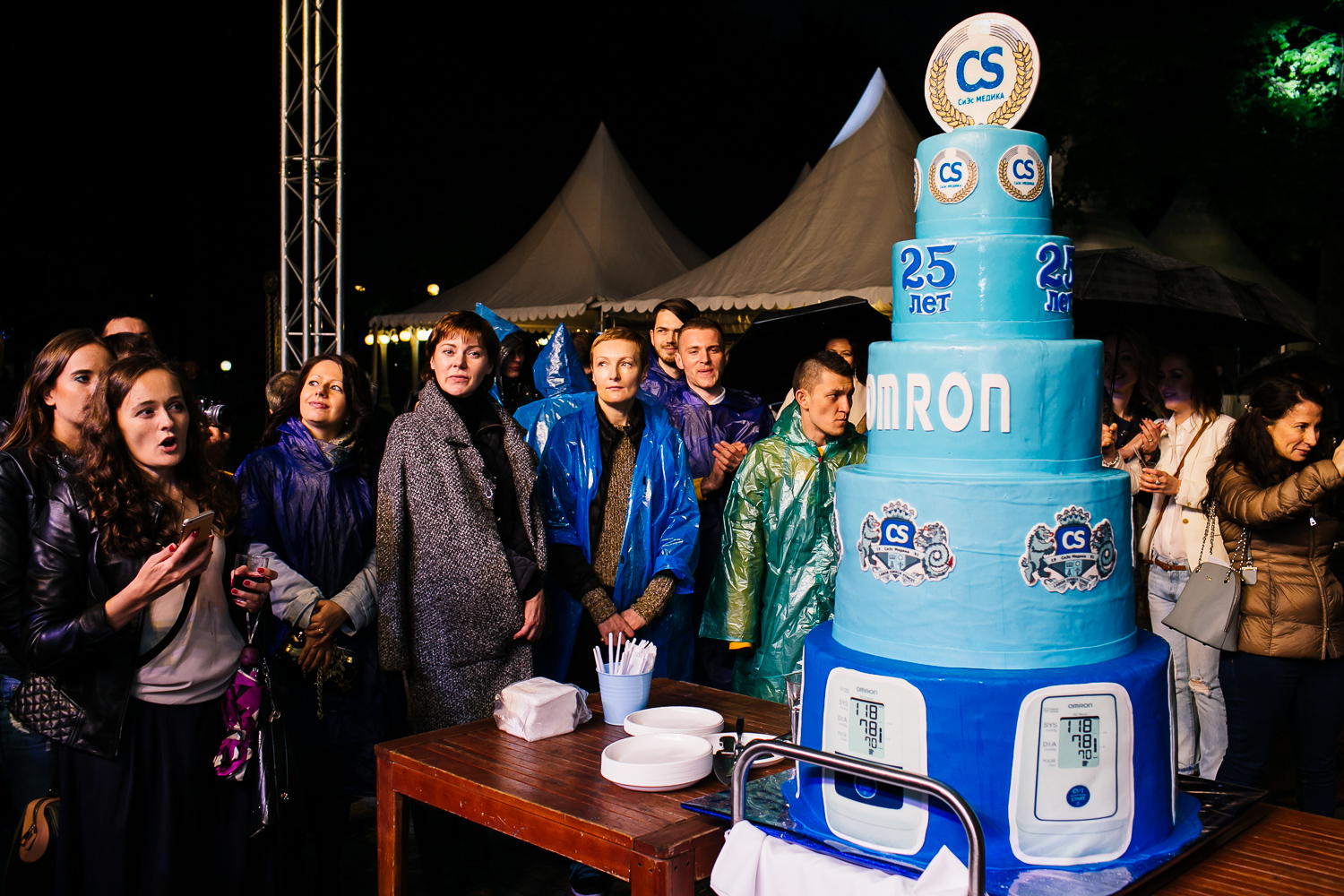 Высота торта была более одного метра и в диаметре 60 см. Торт оформлен в корпоративной тематике компании с группой товаров и логотипами компании Omron.