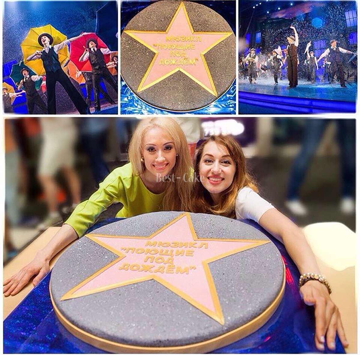 Представляем Вашему вниманию торт в виде Голливудской звезды с одноименным названием "Поющие под дождём", который изготавливала наша кондитерская на закрытие сезона мюзикла "Поющие под дождём" в Москве. Размер торта в диаметре практически метр. Для столь важного события, как и все наши торты кондитеры изготавливали с особым вниманием. Уверены, что эта сладкая Голливудская звезда запомнится всем актёрами и актрисам, принимавших участие в этом грандиозном проекте студии "Стейдж Энтертеймент". А мы в свою очередь желаем новых больших премьер в Москве!